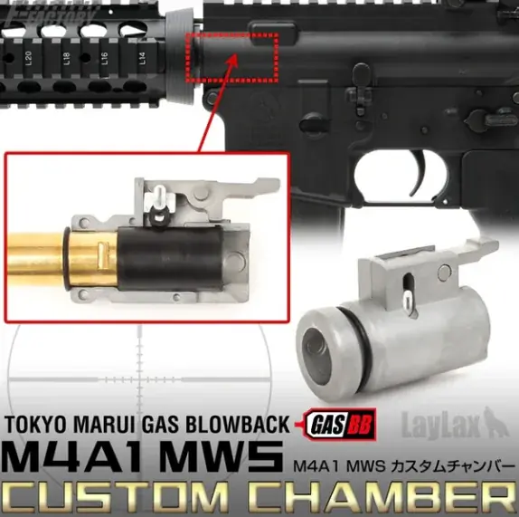 | 東京マルイ リアルガスブローバックM4A1 MWS カスタムチャンバー | 6,300円 | 安定したホップ、ホップテンショナー位置ズレ抑制、M4シリーズ専用設計 | https://laylax.com/products/laylax-080 |