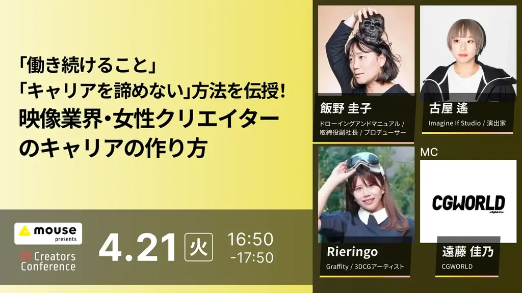 背景には、昨年の共催イベント『W Conference』で寄せられた400名を超える参加申し込みと、アンケートで多数報告された「仕事と家庭の両立」に関する切実な声があります。本カンファレンスはその延長線上にあり、現場で実践できる制度設計、地方移住を含む働き方の選択肢、制作環境づくりなど、複数の角度から「働き続けること」を検証します。
