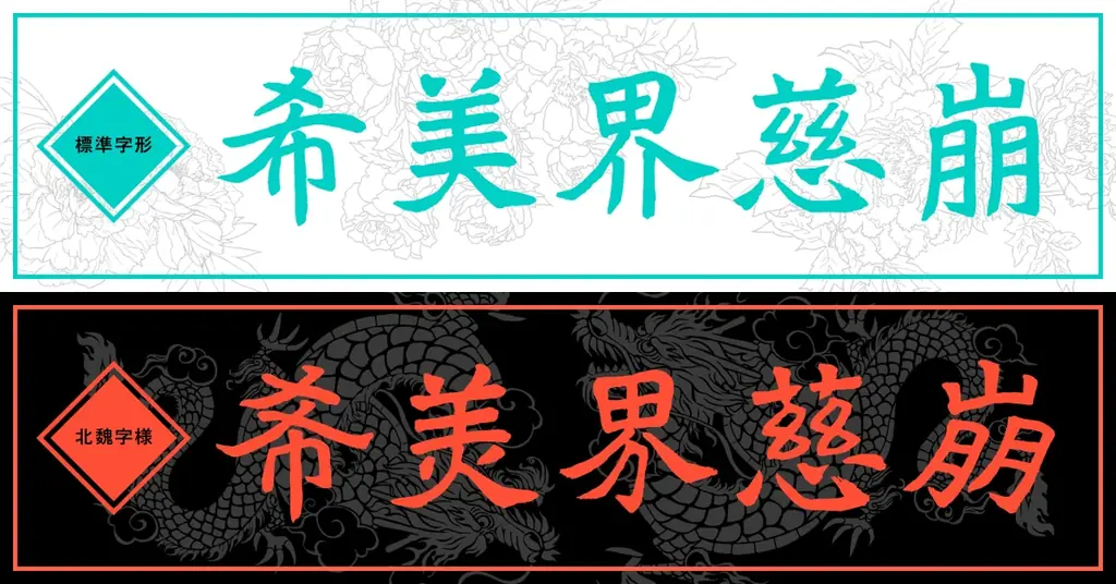 さらに、本書体には「北魏字様」と名付けられた別収録があり、北魏時代の古典的な字形も利用可能です。北魏字様には800文字を超えるユニークな字形が収録されており、古典的なスタイルを忠実に再現しつつ現代の文章構造を損なわない範囲での字形を提供します。