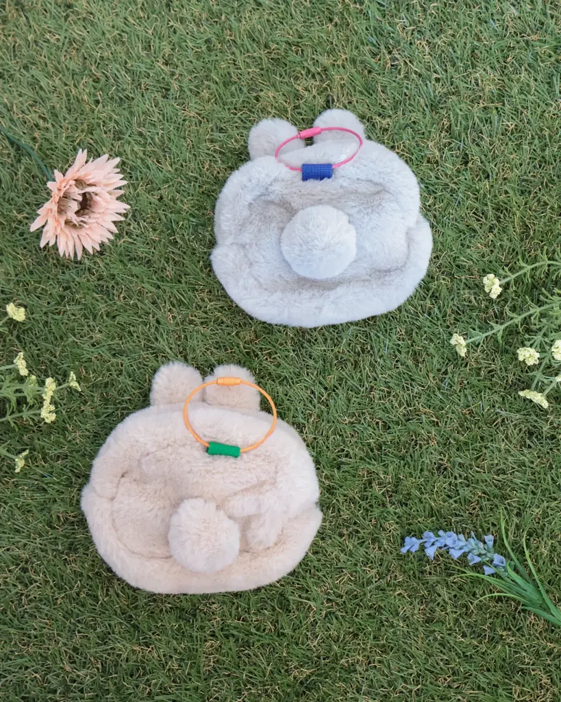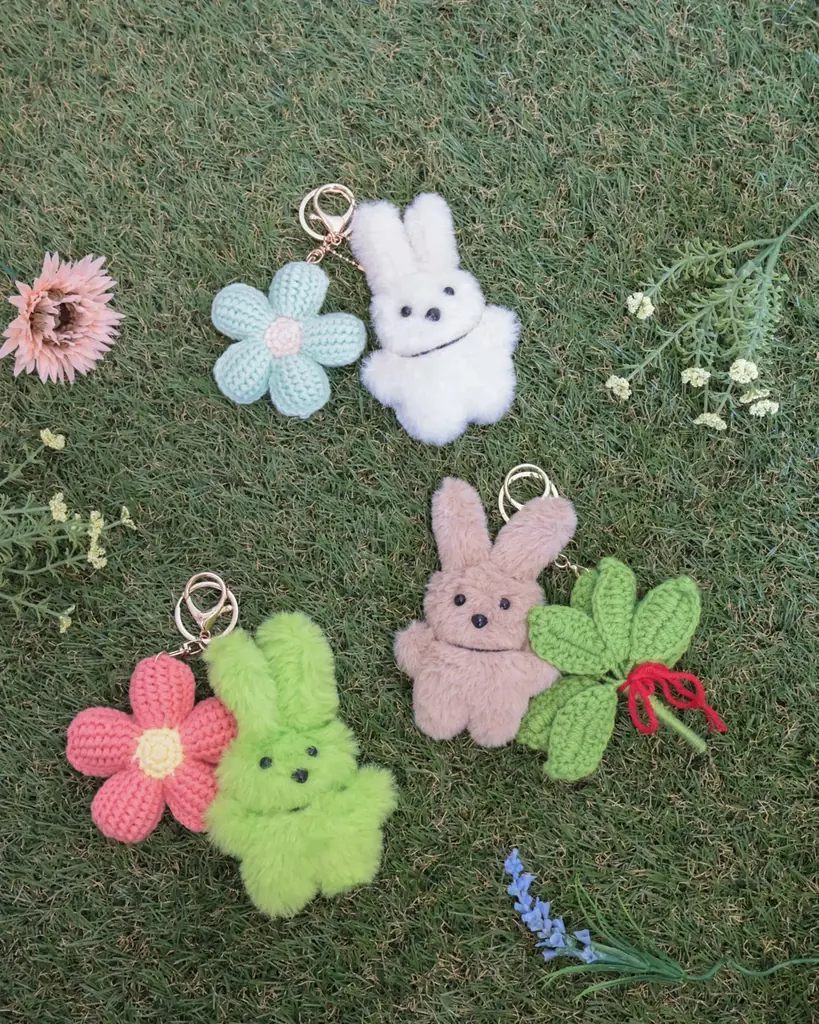 刺繍やモチーフの詳細として、ポーチには耳やしっぽの立体的なモチーフ、チャームには花などのディテールを取り入れており、素材感や形状の工夫で“うさぎらしさ”が表現されています。