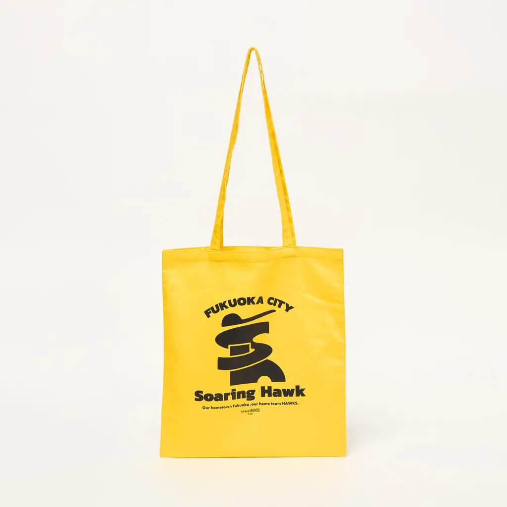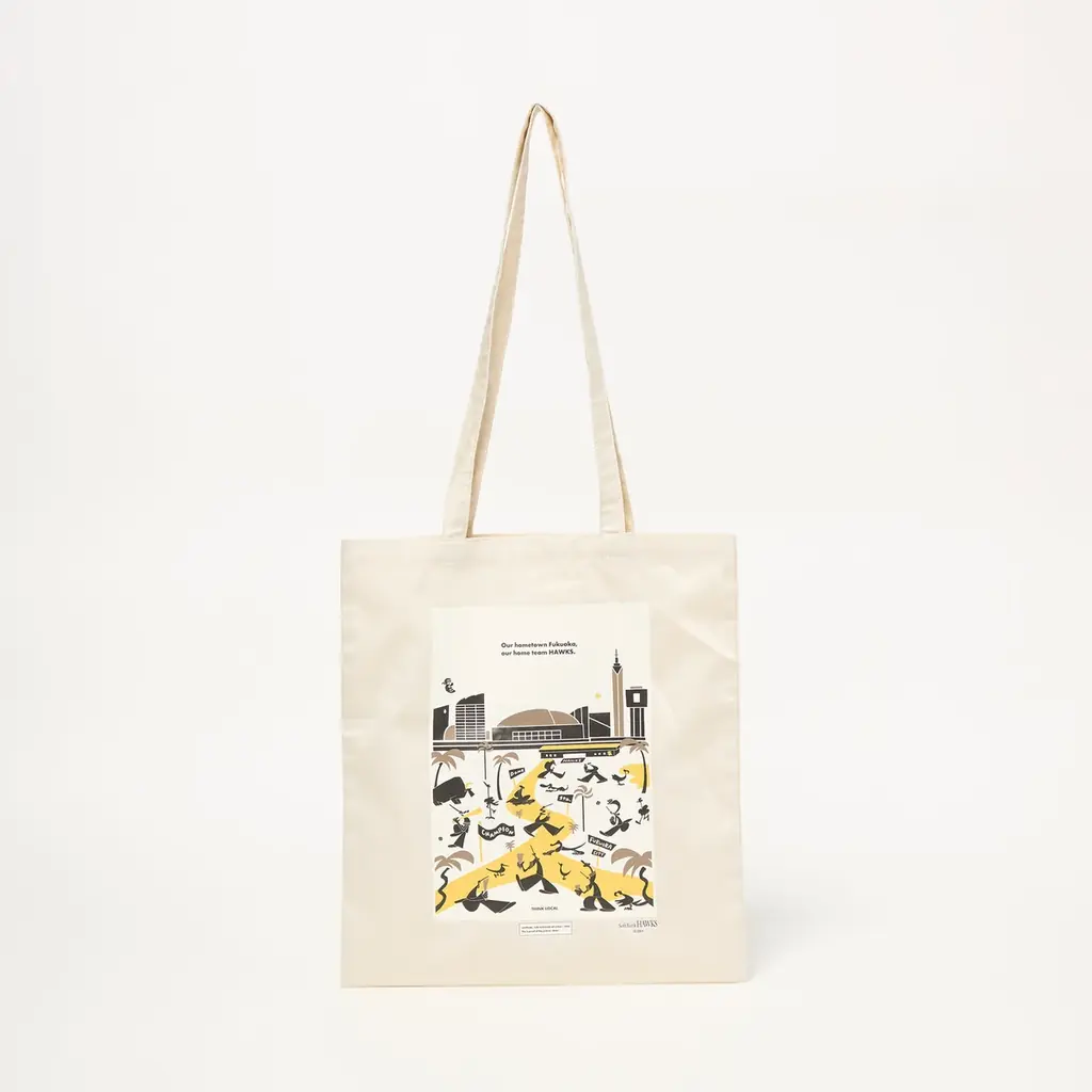 ハンドルは肩掛けしやすい長さに設計され、素材は軽く持ち運びが容易です。Tシャツとリンクしたグラフィックを施しており、持ち歩くことでホークスのムードを日常的に表現できる仕様です。