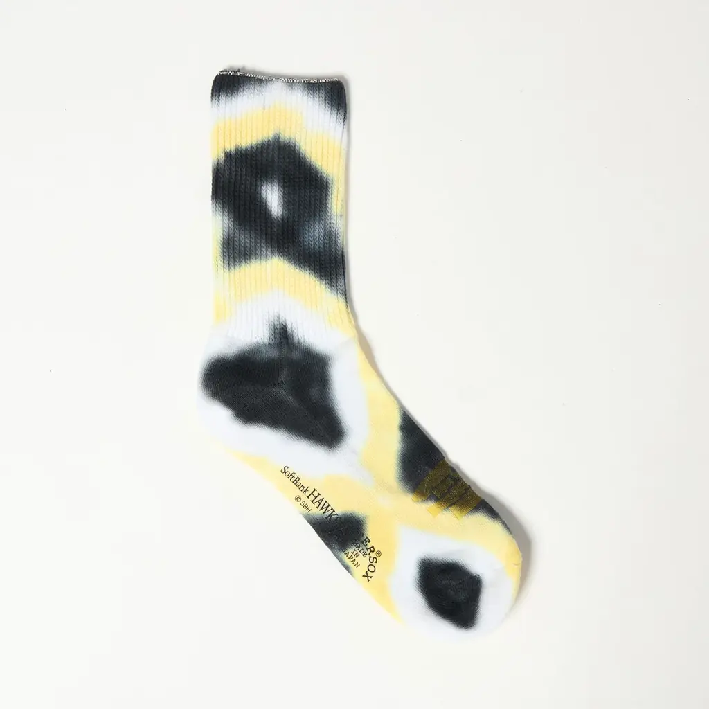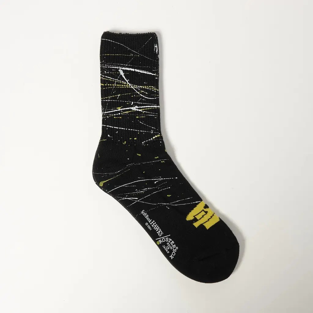 ホークスのチームカラーを想起させるペイントデザインをジャガード縫込みで表現しており、足元からチームカラーを楽しめる一足です。ソックスはグリーンレーベル店舗限定の展開で、HAWKS STORE HOMEやホークス公式オンラインストアでの取り扱いはありません。