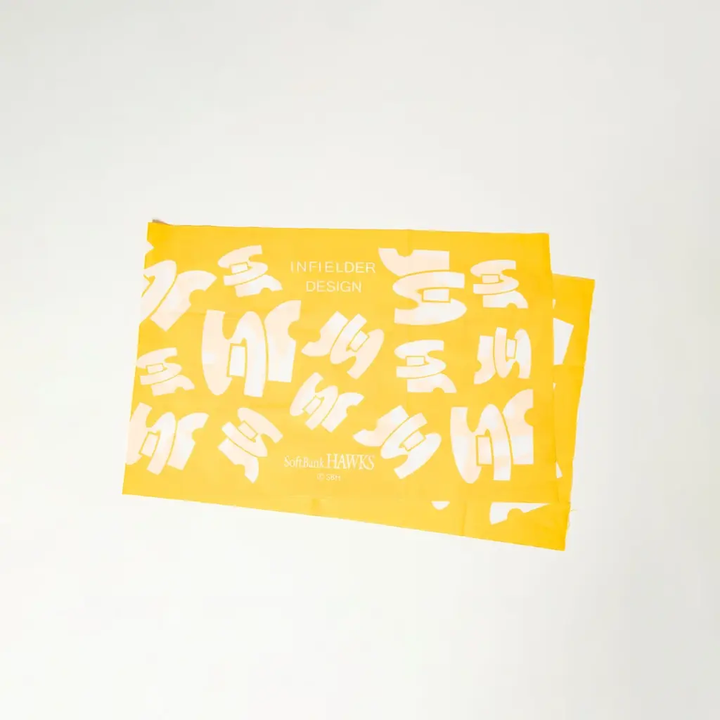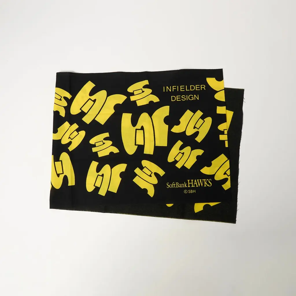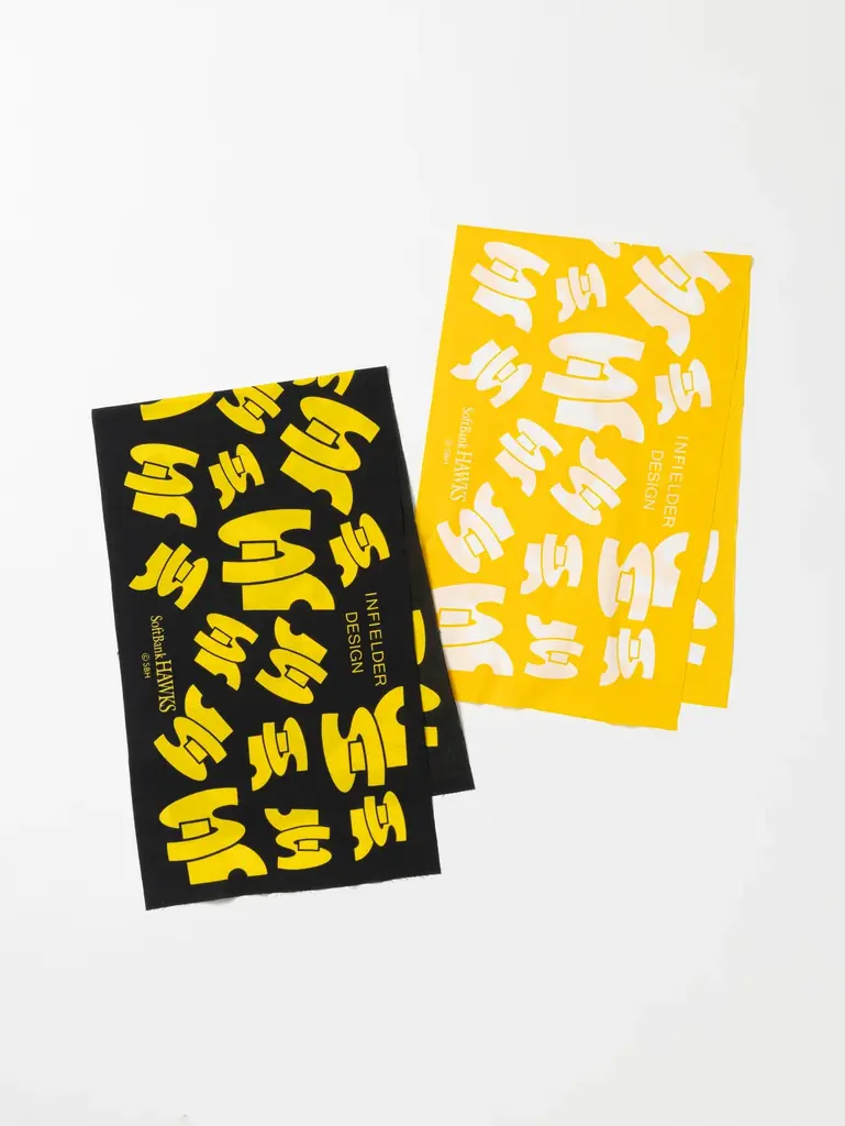 「INFIELDER DESIGN」の手ぬぐいボディにホークスのロゴをモチーフにした総柄グラフィックを施しています。応援シーンでの利用に加え、首元やバッグのアクセントとして、またインテリアとして飾る用途も想定されたデザインです。