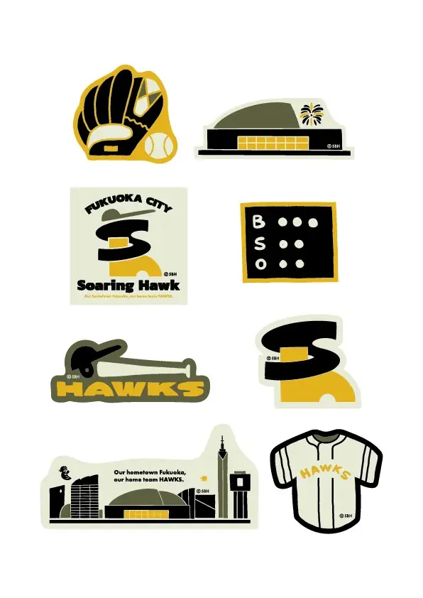 • HAWKS STORE限定(集合柄):カラーはイエロー・グレー。球場周辺のランドマークやファンの活気をグラフィカルに表現したデザイン。HAWKS STORE HOMEおよびホークス公式オンラインストア限定の展開で、グリーンレーベル店舗での取り扱いはありません。