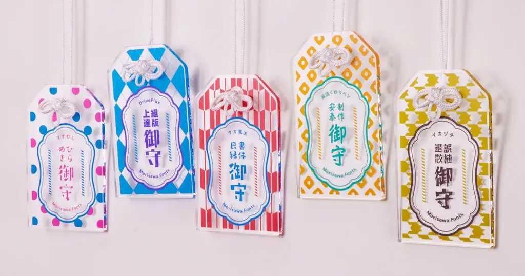 賞品はpixivFACTORYで制作したアクリルお守りで、制作時に提供した書体を使用してデザインした全5種類のラインナップです。各お守りには制作にちなんだ言葉が記されており、表記と書体の組み合わせは以下の通りです。
