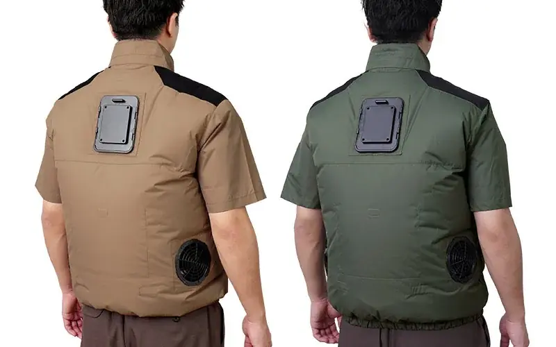 本製品はベストタイプと半袖タイプの2種類を用意し、サイズはフリー(M〜LL対応)、3L、5Lの3サイズ、カラーはネイビー、シルバーグレー、アーミーグリーン、サンドカーキの4色展開です。服地にはチタン加工が施され、遮熱性が向上しています。