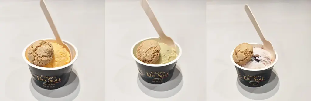 万博イタリアパビリオン人気ジェラート カップ盛り3種(アマレッティ付) ピスタチオ/アマレーナチェリー/ブラッドオレンジみかん 600円