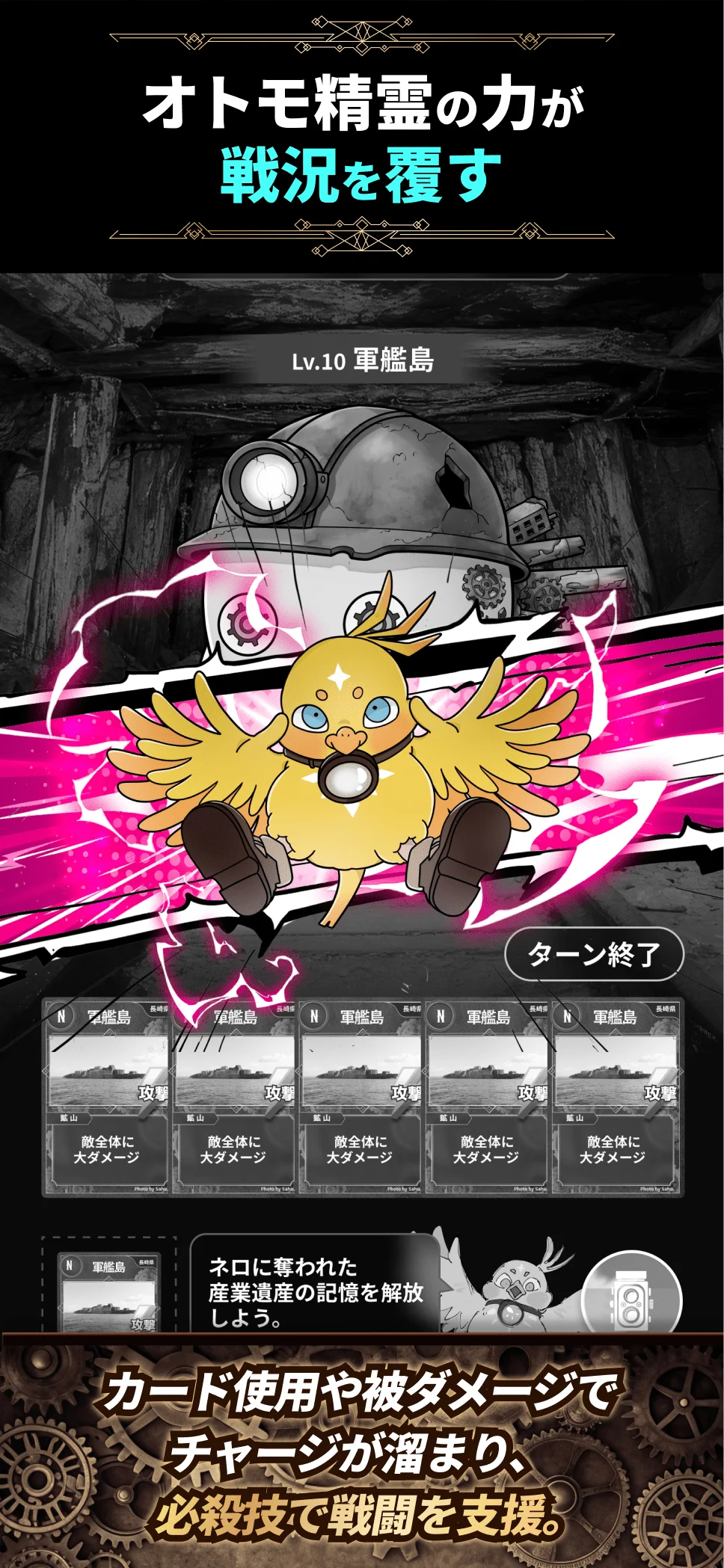 カードはステージクリア時に入手でき、各カードは実在する産業遺産(例えば軍艦島など)をモチーフにしています。カードを集めることで図鑑からその場所の背景エピソードや歴史を段階的に読み解くことが可能です。
