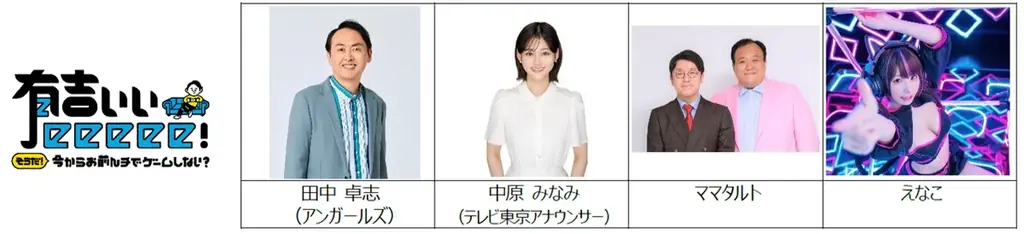- 番組からは「アンガ・田中・ザンギエフを倒せ!挑戦者求ム!」を開催。アンガールズ田中卓志が来場者と『STREET FIGHTER 6』で真剣勝負を行うほか、物販&配信スペースを設置。お笑いコンビ・ママタルトがリアルタイム配信を実施し、4月26日(日)にはコスプレイヤー・えなこがスペシャルゲストとして登場する。