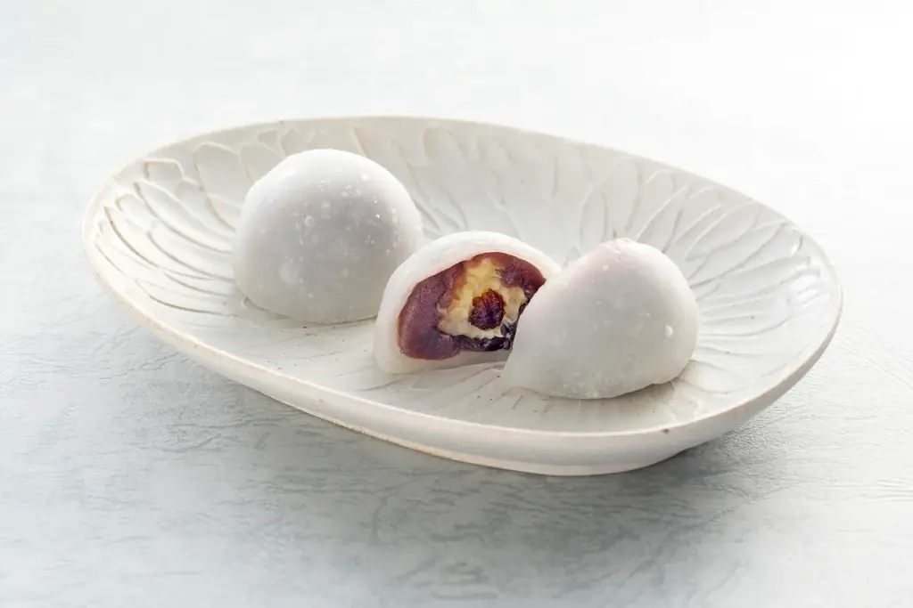- ラム酒に漬け込んだレーズンにクリームチーズとバターを合わせ、やわらかな求肥で包んだ大福。豊かな香りと柔らかな口当たりが特徴。
