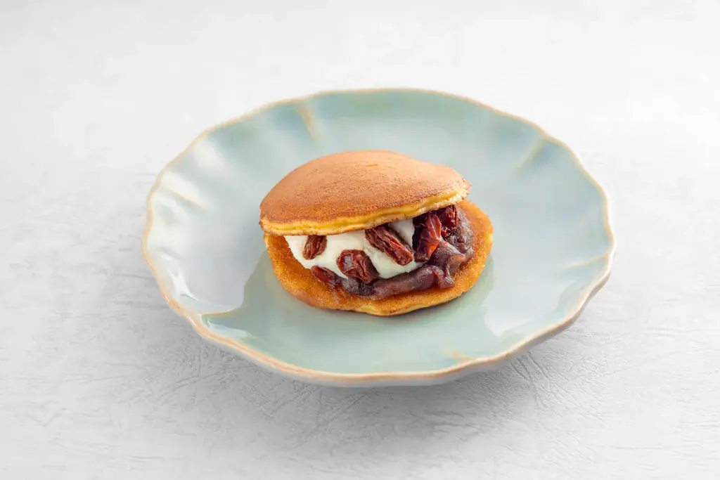 - リコッタチーズのコクとラム酒漬けレーズンの香りが調和する和洋折衷のどら焼き。しっとりとした生地で包み込む構成。