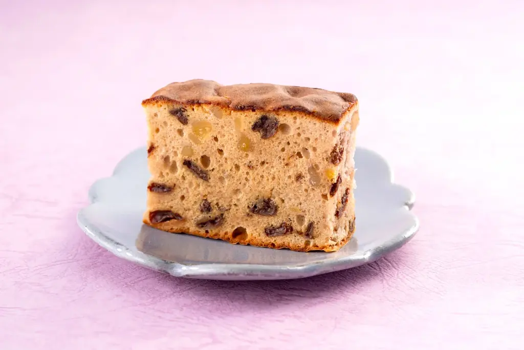 - なめらかなこしあんを仕込み、カステラ生地にラムレーズンとほっくりと甘い栗を閉じこめた一品。和の餡と洋の生地の融合。