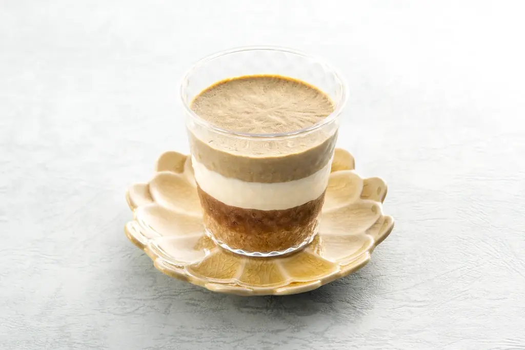 - コーヒーを含ませたスポンジに粒あんを重ね、ほうじ茶の香るチーズクリームを合わせたあんティラミス。レーズンをしのばせることで香ばしさに甘酸っぱさのアクセントが加わる。