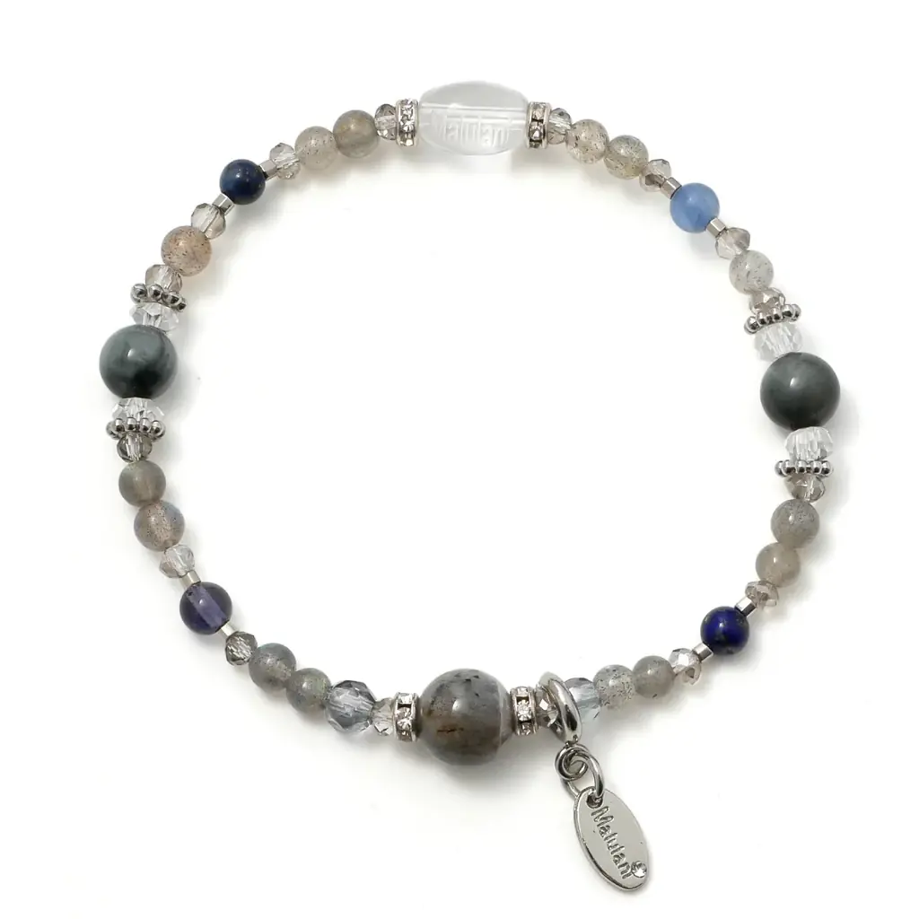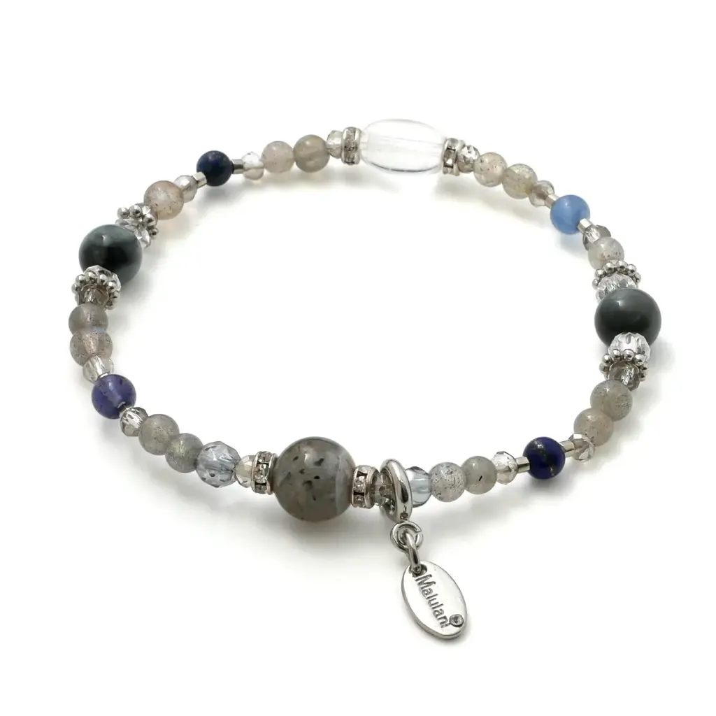 ラブラドライトやラピスラズリ、カイヤナイト、アイオライト、イーグルアイ、シルバーオーラ、水晶を組合せ。直感・洞察・仕事運や浄化、厄除けのサポートを想定した設計。