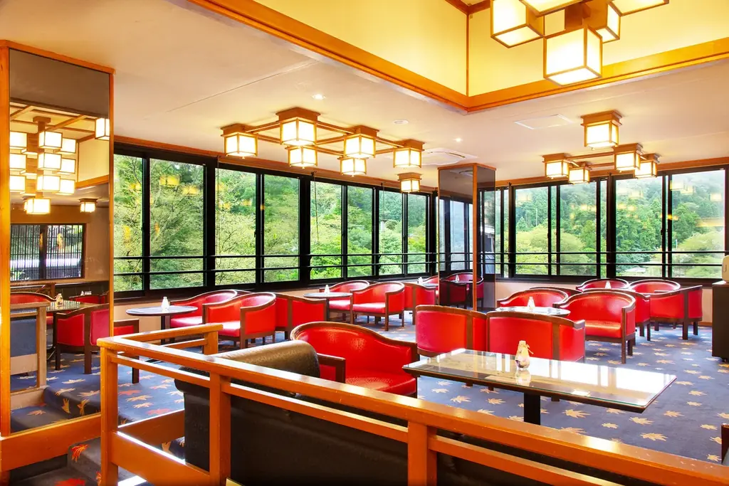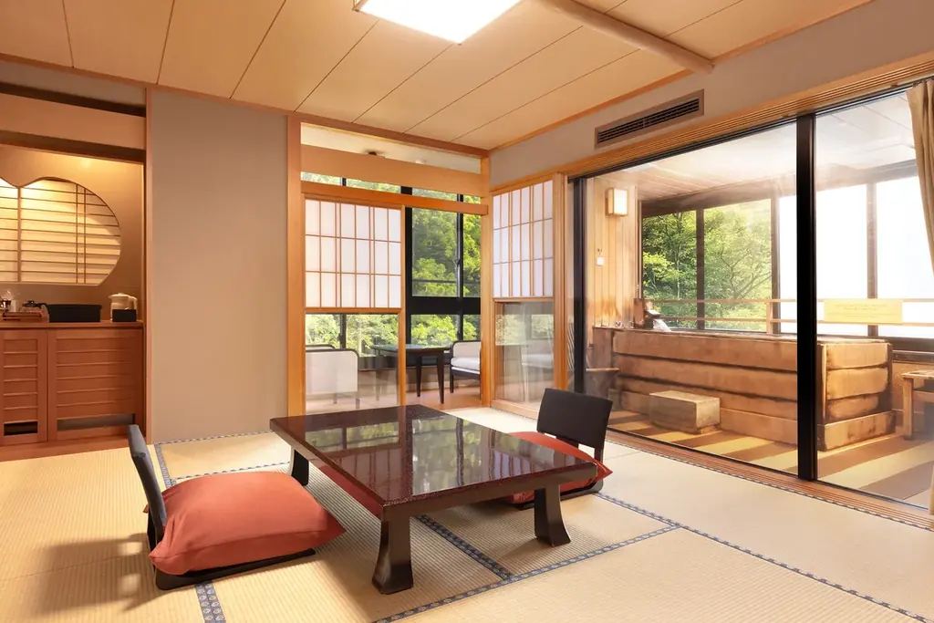 かがり吉祥亭は鶴仙渓沿いに建ち、全48室で6タイプの客室構成を持つ。展望風呂付き客室「新月」や、シモンズ社製ベッドを備えた和洋室など、宿泊スタイルに合わせた選択が可能だ。露天風呂を含む大浴場や檜造りの貸切風呂、ロビーラウンジからの鶴仙渓の眺望が特徴である。