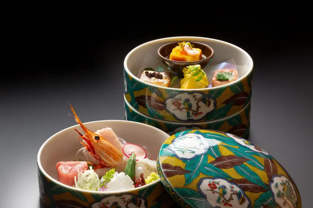 夕食は日本海・加賀の食材を中心とした会席料理が基本で、会席の例として「能登豚しゃぶしゃぶ会席」「天婦羅自慢会席」等が提示されている。1室につき1台の鯛のお造りが付くことにより、海鮮の存在感が強いコース構成になっている。朝食は「加賀朝食」が基本だが、客室タイプによっては選べる朝食メニュー(プレミアム丼等)も用意されている。