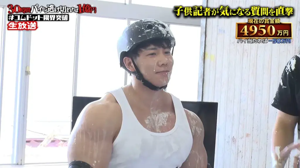 コムドット一行は次にボディビルダーの横川尚隆が待ち構える部屋へ向かい、指示された箇所以外が地面につくと大量のパイを浴びる「ツイスターゲーム」に挑戦した。ルールは30ターン継続できなければ全員にパイの滝が降り注ぐという過酷なものだった。