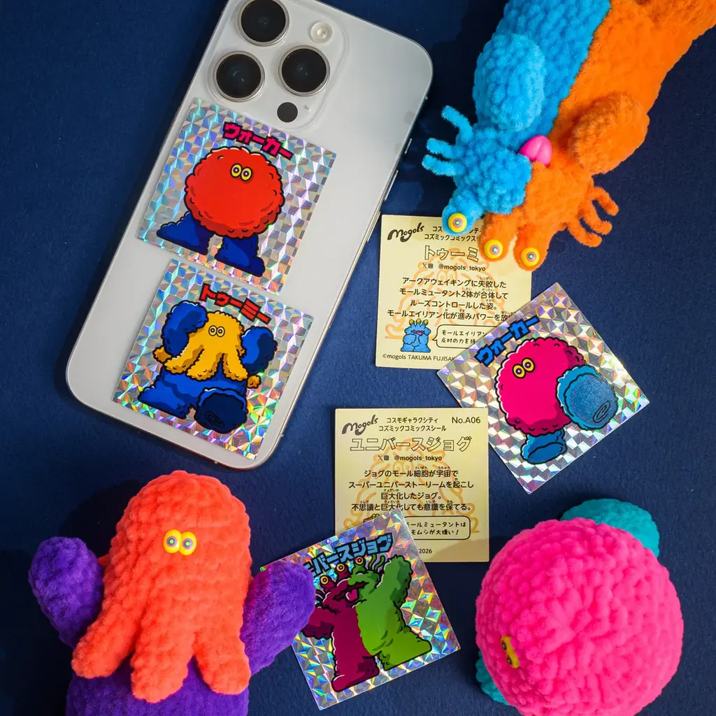 全6種のラインナップで、最大約H106mmのビッグサイズのフロッキーフィギュア。プレスリリースではUNIVERSE JOG、WORKER、TWOMEの掲載があり、各キャラのプロフィール入りキラキラステッカーが付属します。