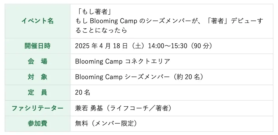 当ワークショップは、コーチング的な問いかけと参加者同士の対話を組み合わせた構成で進行します。兼若氏によるファシリテーションのもと、参加者は短時間で自らの内面と向き合い、言葉にしていくプロセスを体験します。会場はBlooming Camp(グラングリーン内、開催日:2026年4月18日(土))で、限定された人数で実施されることが想定されます。