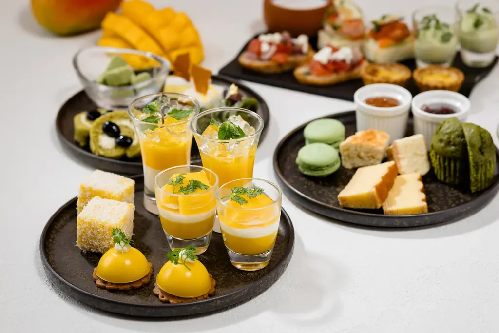 今回のアフタヌーンティーは「宮崎県産マンゴーと抹茶」を主軸に、マンゴーの濃厚な甘さと抹茶の香り・ほろ苦さを組み合わせた多彩なデザートが特徴です。素材の産地表記も明記されており、宮崎県産マンゴーや西尾抹茶、北海道産あずきなどの地域素材が活用されています。