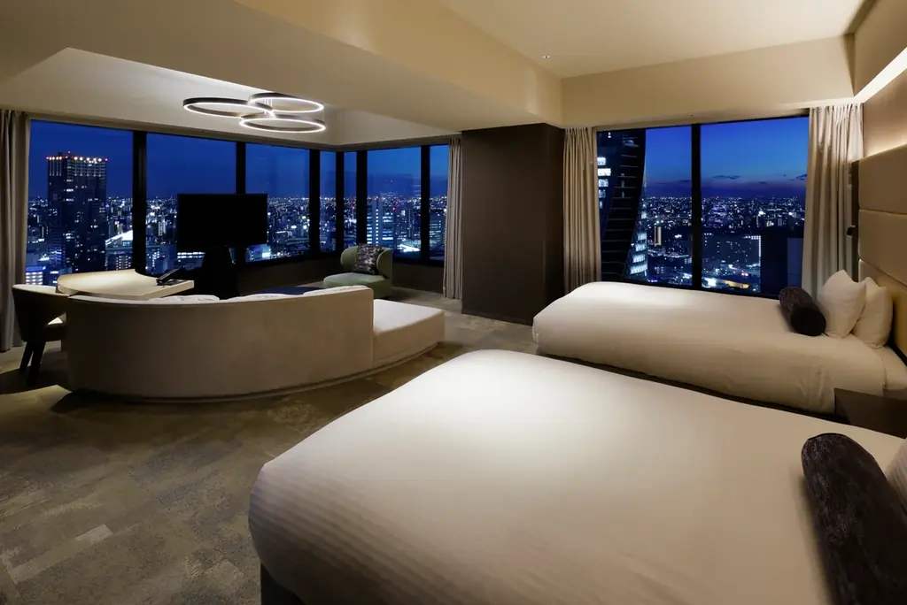 三井ガーデンホテル名古屋プレミアは名古屋駅から徒歩約5分、シンフォニー豊田ビルの18〜25階に位置する高層ホテルです。ロビーは地上約80mに位置し、名古屋市街の眺望が得られます。