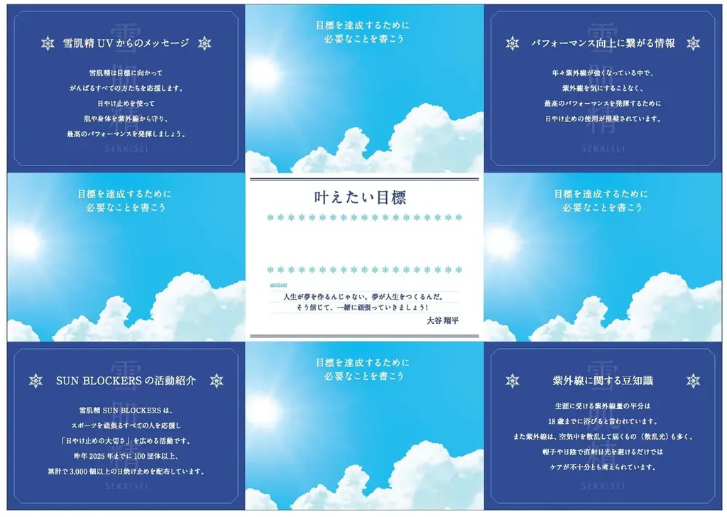 「雪肌精 SUN BLOCKERS」は、夏の紫外線と戦うすべてのスポーツ選手を応援する取り組みで、2023年に始まり今年で4年目を迎える。2026年は「雪肌精 SUN BLOCKERS 2026」と題し、日やけ止めの贈呈に加え、大谷選手が高校時代に活用していたマンダラチャートに着想を得た「雪肌精パフォーマンスチャート」を配布することが発表された。