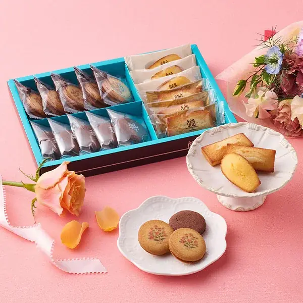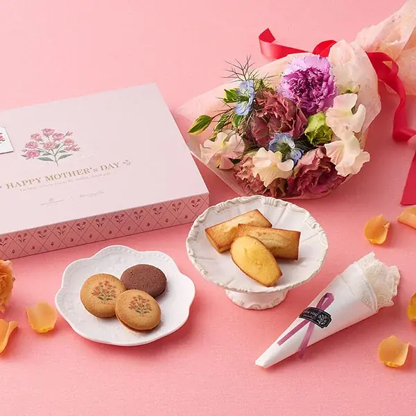 • 内容:フィナンシェ3個、マドレーヌ3個、ラング・ド・シャ(フードプリント〈Thank you Mother〉)5個、ラング・ド・シャ(チョコレート)5個、イニシャルミニタオル1枚(M/Y/A/S/N/R/Kの7種類より選択)、メッセージカード1枚