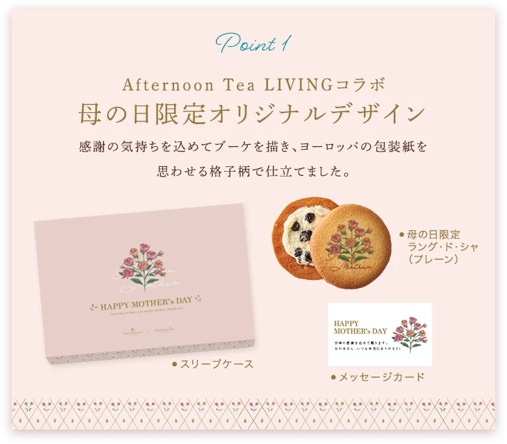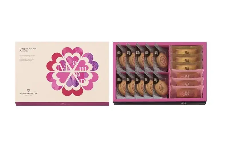 厚焼きのラング・ド・シャにラムレーズン入りのクリームをサンドした詰め合わせで、プレーンのラングには母の日プリントのデザインが施されています。ティータイムを彩る一箱として想定された商品です。