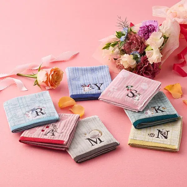 公式オンラインショップへのリンク:ラング・ド・シャ・アソート(イニシャルミニタオル付)。イニシャルはM/Y/A/S/N/R/Kの7種類から1枚を選択できます。