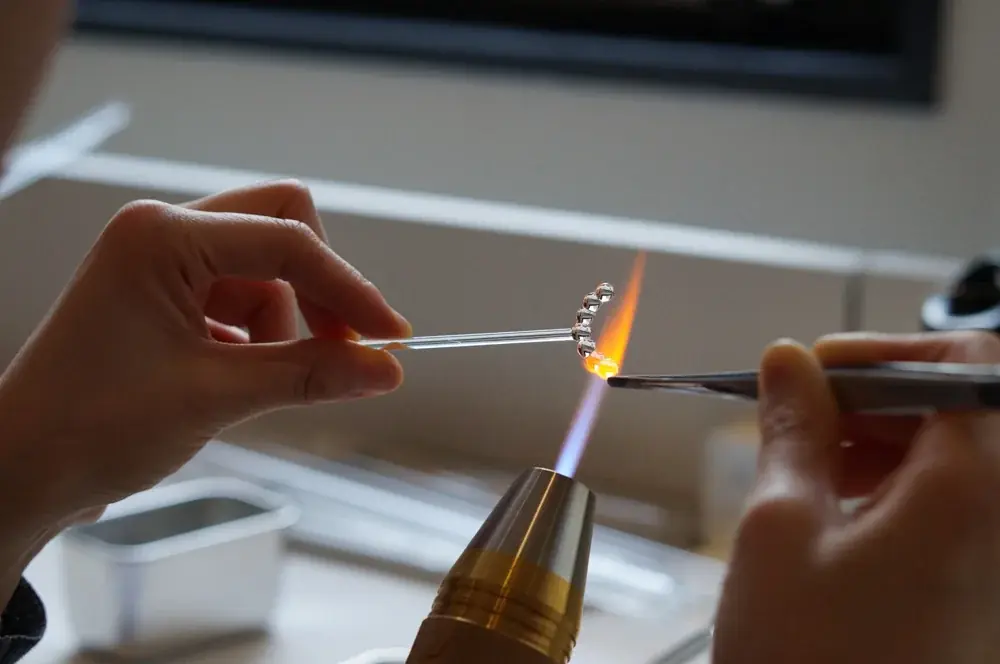 HARIOが製造する耐熱ガラスは熱に強く加工性に優れているため、繊細で美しい造形を実現できる。耐熱ガラスは比重が軽く、長時間身につけても負担が少ない点が特徴だ。今回のアクセサリーは、伝統的な技法であるバーナーワークによって一つ一つ職人の手で成形されている。