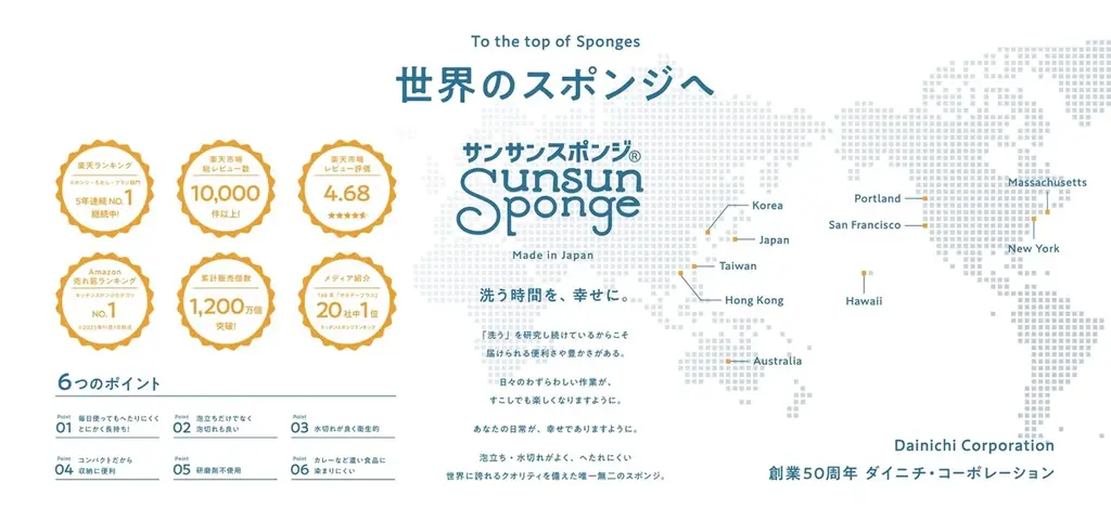 サンサンスポンジ自体も実績があり、楽天市場の掃除用品スポンジ部門で6年連続1位(2018年8月~2026年3月現在)を達成しています。また、2025年3月9日21:52時点で楽天市場総合リアルタイムランキング1位を記録した点もプレスリリースで示されています。