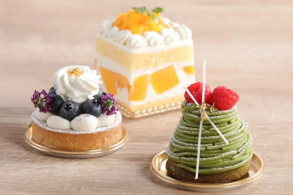 スイーツの詳細:抹茶、マンゴー、ベリー、それぞれの素材と構成