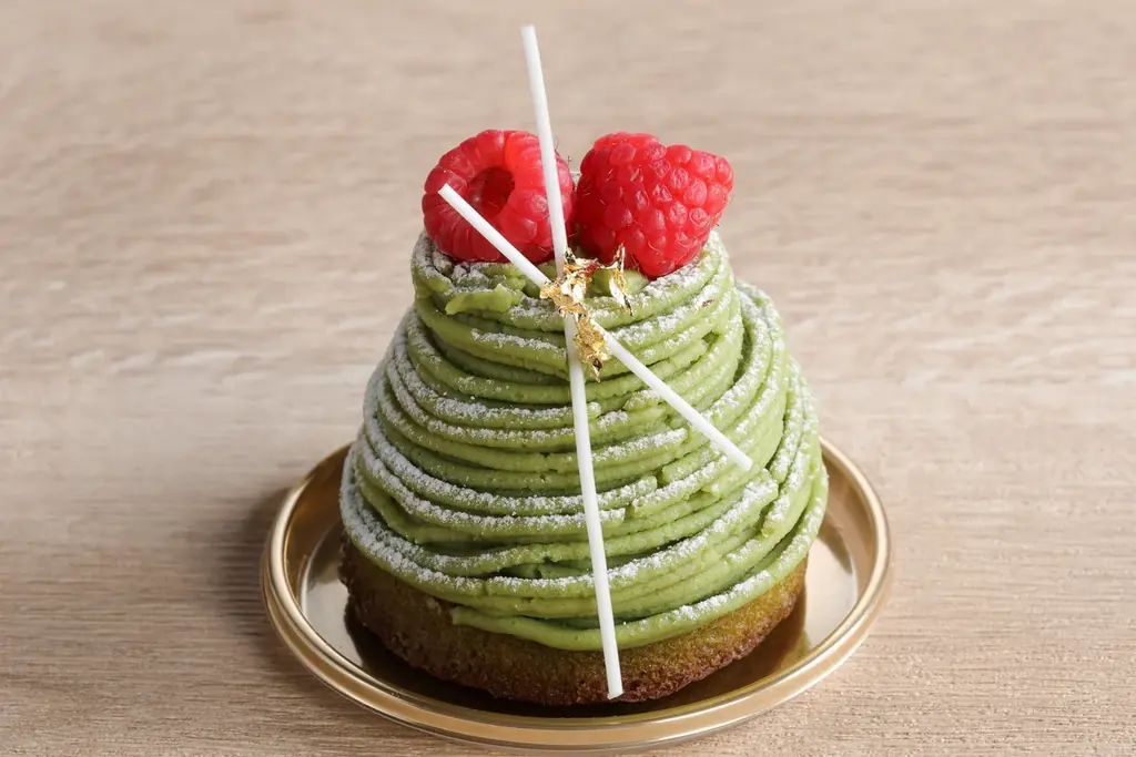 抹茶モンブランは、渋みのある抹茶とやさしい甘みの和栗、アクセントとなるラズベリーの酸味を一体化したケーキです。土台には抹茶フィナンシェを用い、その上にラズベリーのジュレを閉じ込めたバニラムースをのせています。
