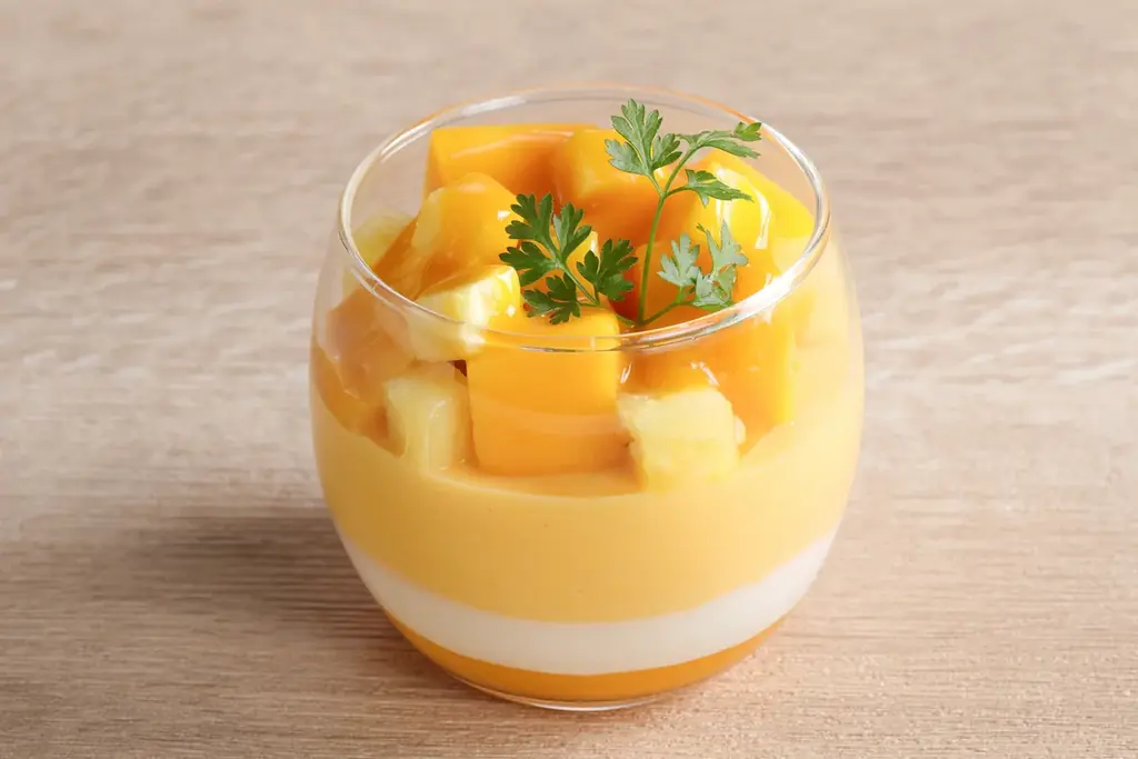 マンゴープリンは3層のグラスデザートです。下層からマンゴージュレ、中央にココナッツムース、上層にマンゴームースを重ね、マンゴーとパイナップルを飾りました。仕上げにパッションフルーツのソースを流しています。