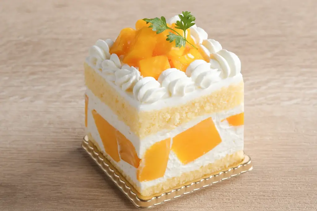 マンゴーショートは、ふんわり焼き上げたジェノワーズ生地にマンゴーとマンゴー風味の生クリームをサンドしたショートケーキです。マンゴーのとろける食感と果実の濃厚な甘さが特長です。