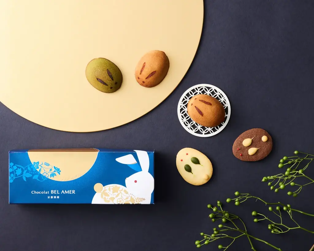 「京のうさぎ」シリーズは、月と兎の雅な風情をモチーフにした焼き菓子ラインです。京のうさぎサブレはバターの香りと軽やかな食感が特徴で、ショコラ味とプレーンの二種を用意しています。