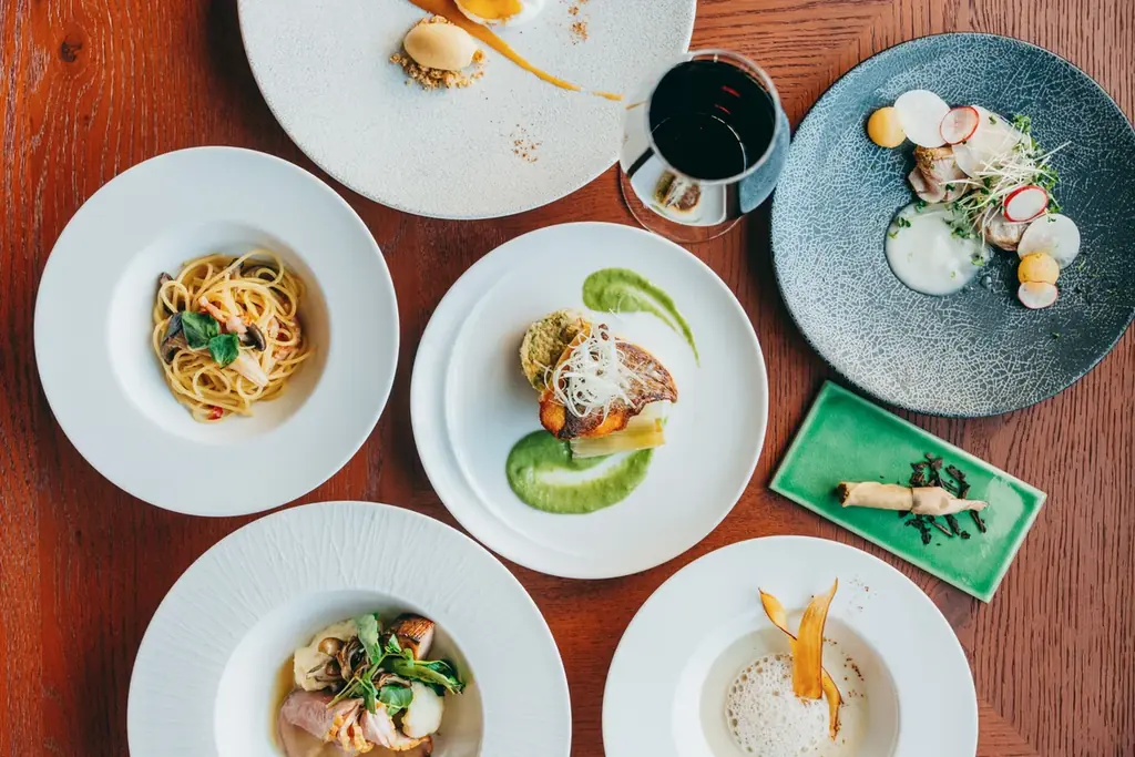 洋食屋ケムリ「葛城春コースディナー」。ツツジの赤をイメージした前菜から始まるコース。御所産食材を用いたGOSE Local Gastronomy。地酒「風の森」ペアリング選択可。
