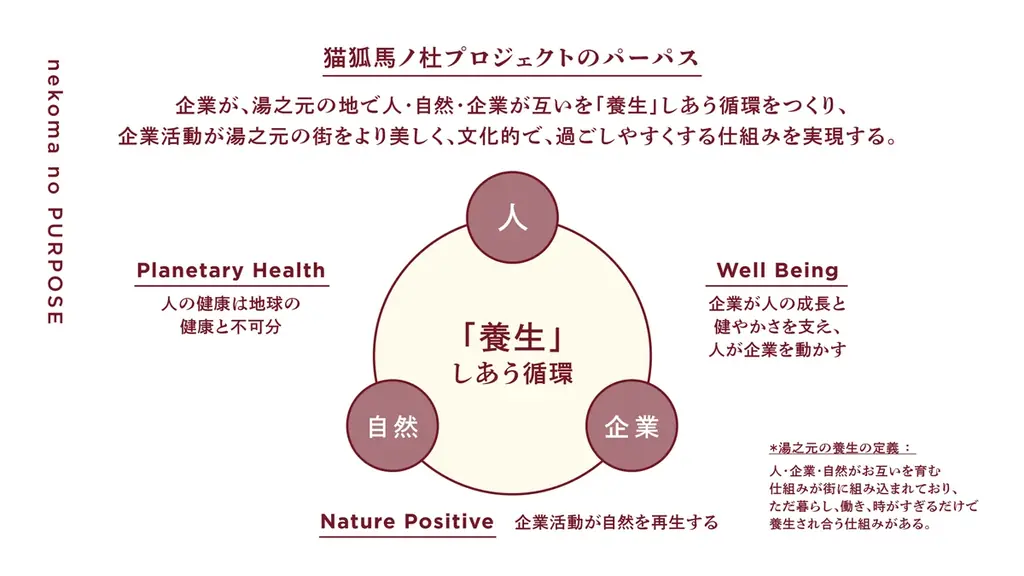 本プロジェクトの中核となるコンセプトは養生(ようじょう)である。プレスリリースでは「ただ住んでいるだけで健康になり、ただ暮らしているだけで自然が回復し、ただ事業をしているだけで企業が豊かになる」と定義されており、人の健康(Well-being)と自然の回復(Nature-Positive)を両立する場として設計される。