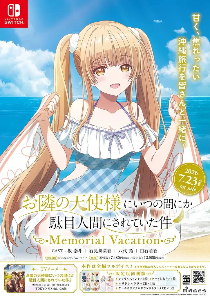 株式会社MAGES.は、2026年7月23日発売予定のNintendo Switch™ 2/Nintendo Switch™用アドベンチャーゲーム「お隣の天使様にいつの間にか駄目人間にされていた件 Memorial Vacation」に関して、出演声優の直筆サイン色紙などが当たるSNSキャンペーンをゲーム公式X(旧Twitter)で実施すると発表しました。本稿ではキャンペーンの応募方法や景品の取り扱い、当選発表と注意事項を整理してお伝えします。