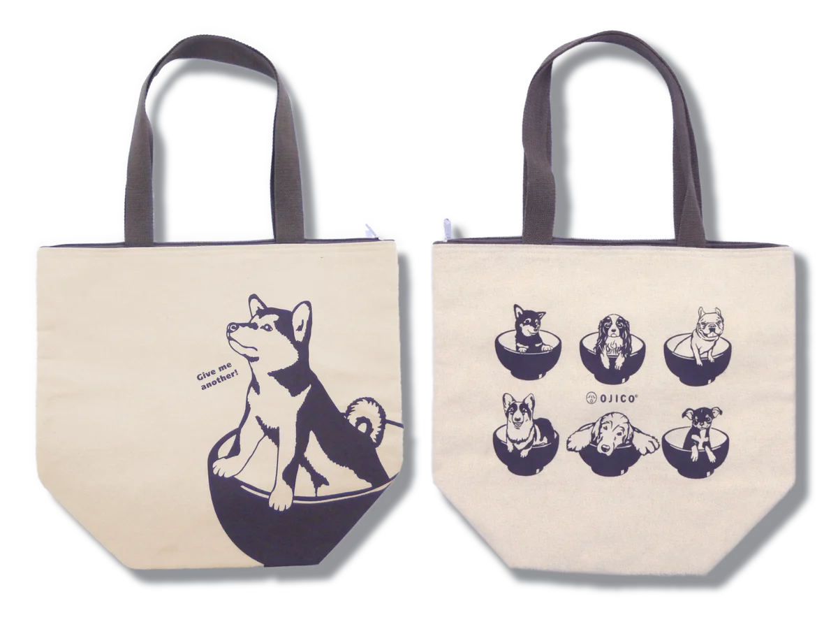 ノベルティとして用意された保冷トートは、OJICOで人気の高い「WANKO」シリーズから「WANKO3」をモチーフにしたデザインです。犬の“わんこ”と“わんこそば”を掛け合わせたユーモアあるビジュアルで、お椀の中に多様な犬種のわんこが収まっているデザインが特徴です。