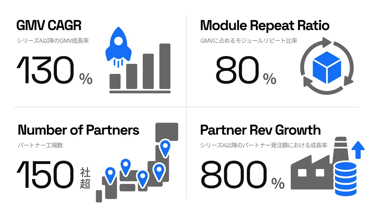 この仕組みにより、従来は属人的に管理されていた設計・発注データを資産化し、QCD(品質・コスト・納期)競争力を高めることが可能となっています。GMVはシリーズA以降でCAGR130%という高成長を示しています。