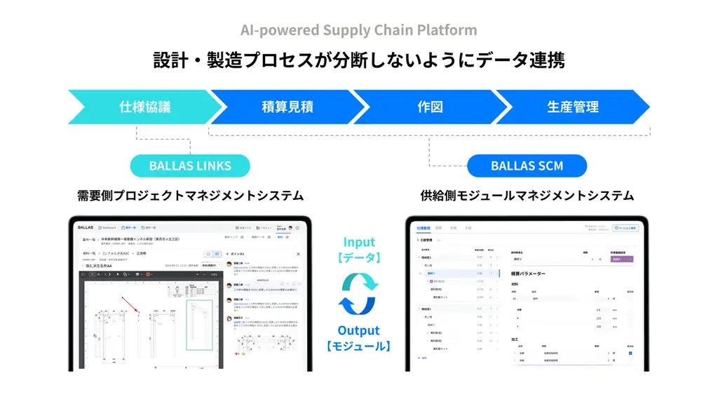 調達資金の一部は、買い手側からの要望に応える形で開発されたプロジェクトマネジメントシステム「BALLAS LINKS」の運用加速に充てられます。BALLAS LINKSは、単に部材の設計・調達を支援するだけでなく、建設プロジェクトのワークフロー全体を視野に入れた情報連携とプロセス自動化を目指します。