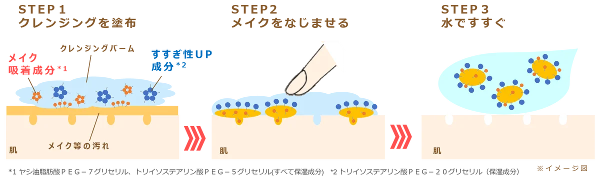 以下に、各段階の特徴を詳述します。製品にはメイク吸着成分やすすぎ性向上成分を配合し、すすぎ時のメイク再付着を防ぐ工夫が施されています。