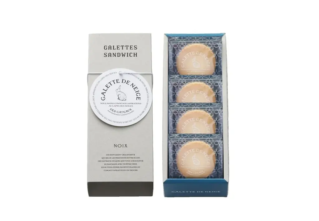 内容詳細:4個入 / 税込価格:1,296円(本体価格:1,200円)。北海道産バターを使用し、やさしい甘さのクルミがたっぷり入ったケーキをミルキーなホワイトグラサージュでコート。バターと小麦の香りが特徴の口どけの良いガレットでサンドされています。