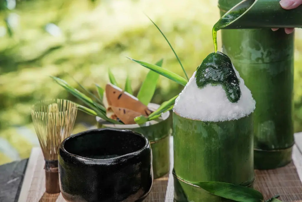 チェックイン前に味わう特製かき氷は、シロップに爽やかな蓼(たで)と和三盆を合わせています。器は竹製で、嵐山の青々とした景色を表現した仕立てです。平安時代の記述にある削り氷(けずりひ)に甘味を添える文化(*3)を現代風に再現した趣向です。