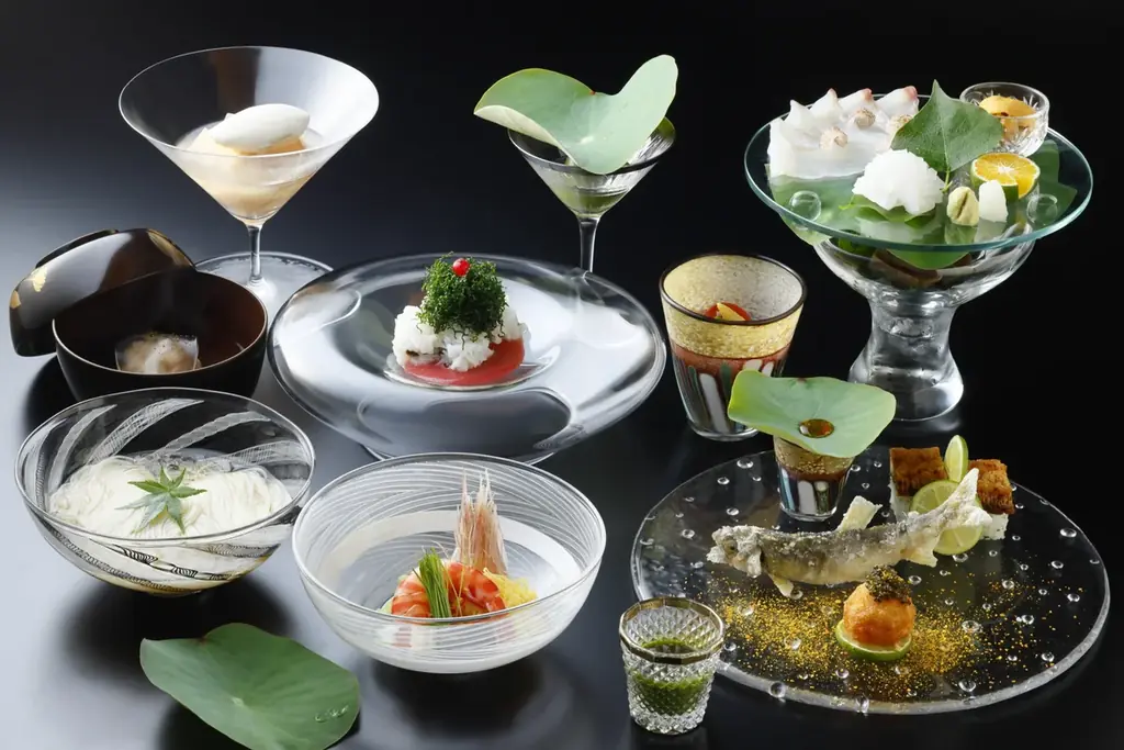 夕食は窓辺の特等席で、夏の陽が沈む情景を眺めながら味わいます。料理は会席形式で、梅雨の恵みを受けた旬の鱧の先付や、夏野菜をコンソメジュレで楽しむ冷鉢などを揃え、見た目にも涼やかなガラスの器に盛り付けて提供されます。