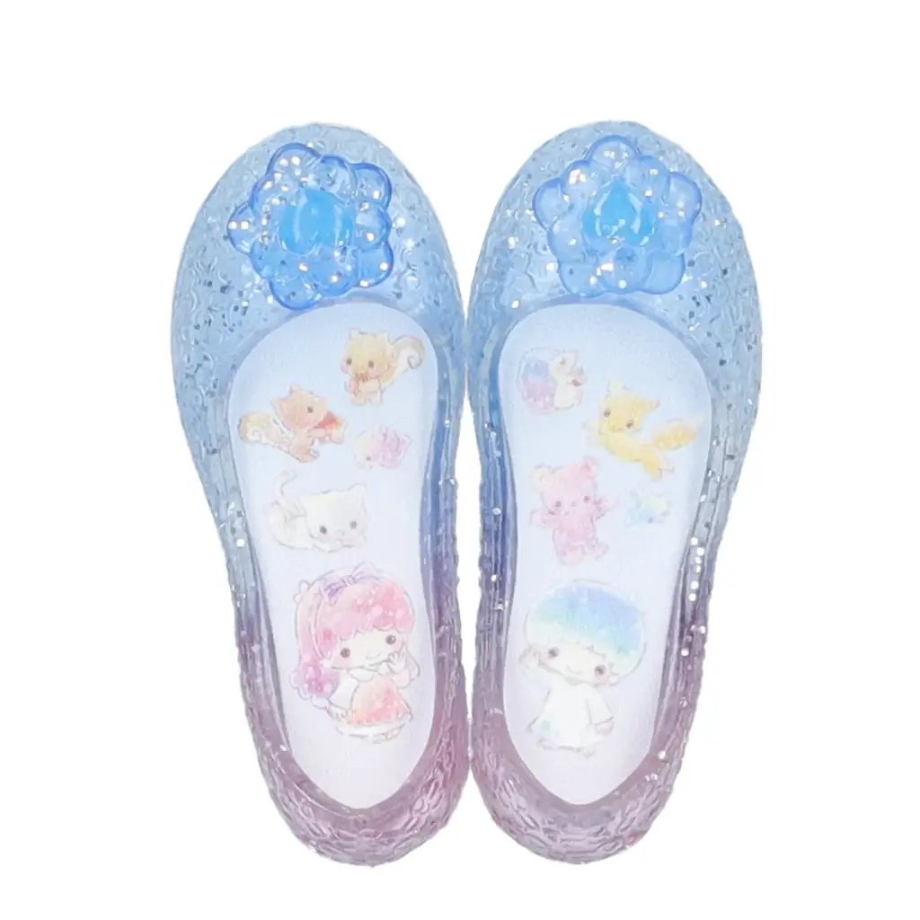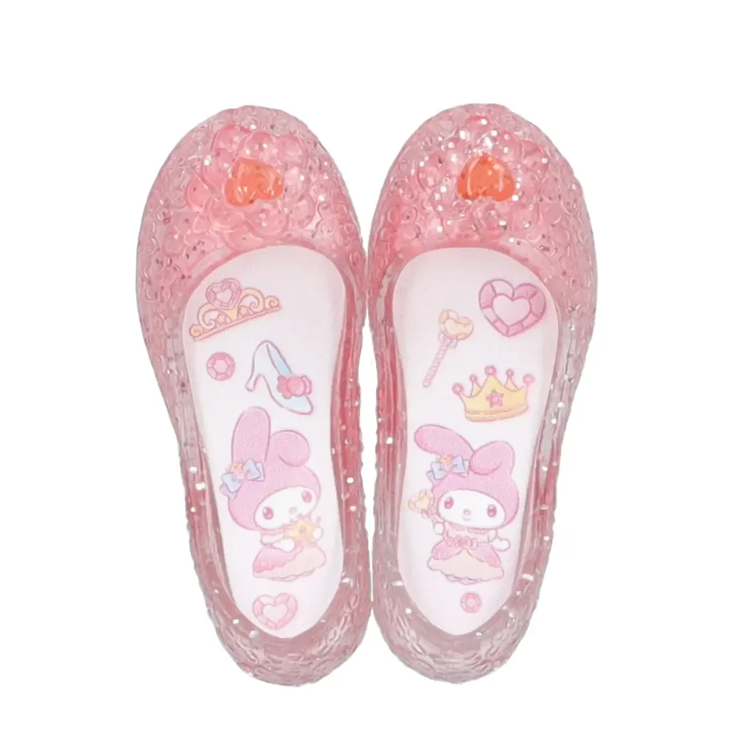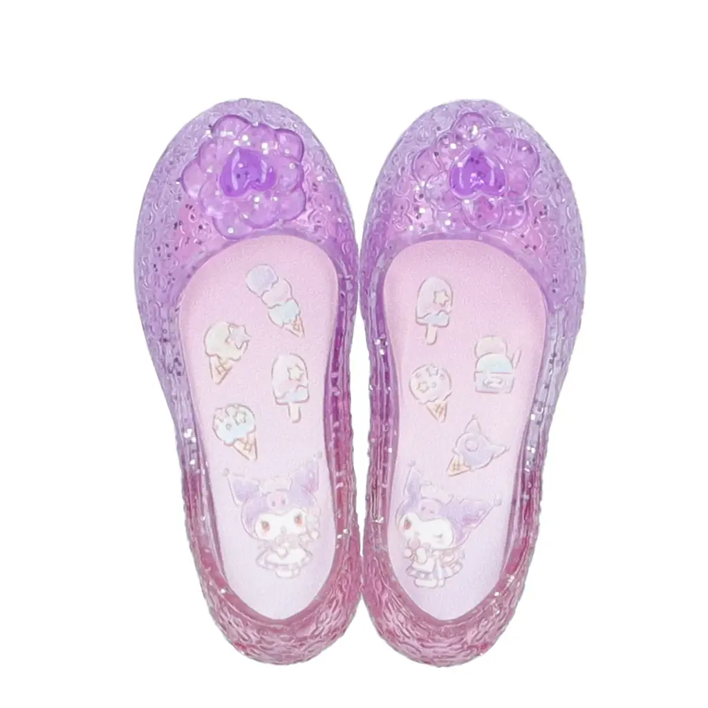 本商品の最大の特徴は、ラメ入りのやわらかい素材と立体的な花モチーフです。ボディはキャラクターごとに色が異なり、中敷き部分にサンリオキャラクターズのデザインが施されています。透明感と光沢を帯びたクリア素材感は、実際の子供用サンダルで見かけるキラキラ感を小さく再現しています。