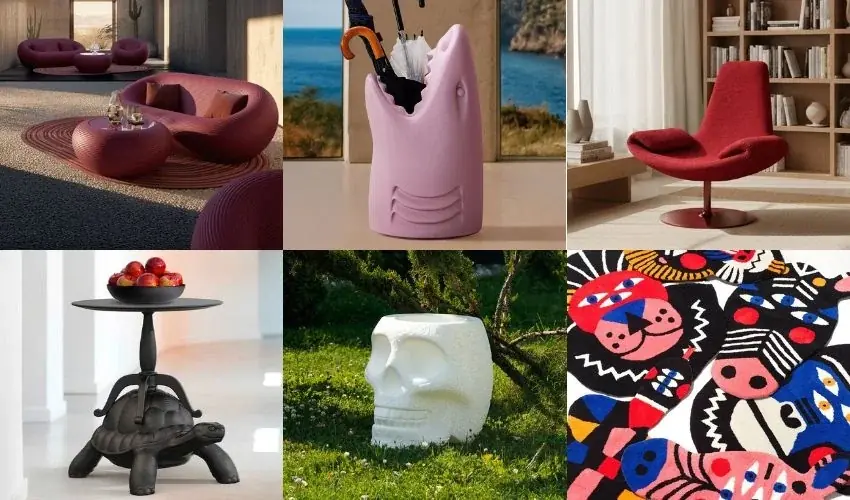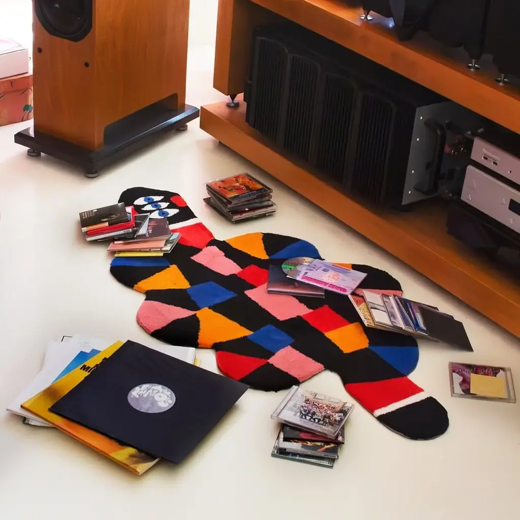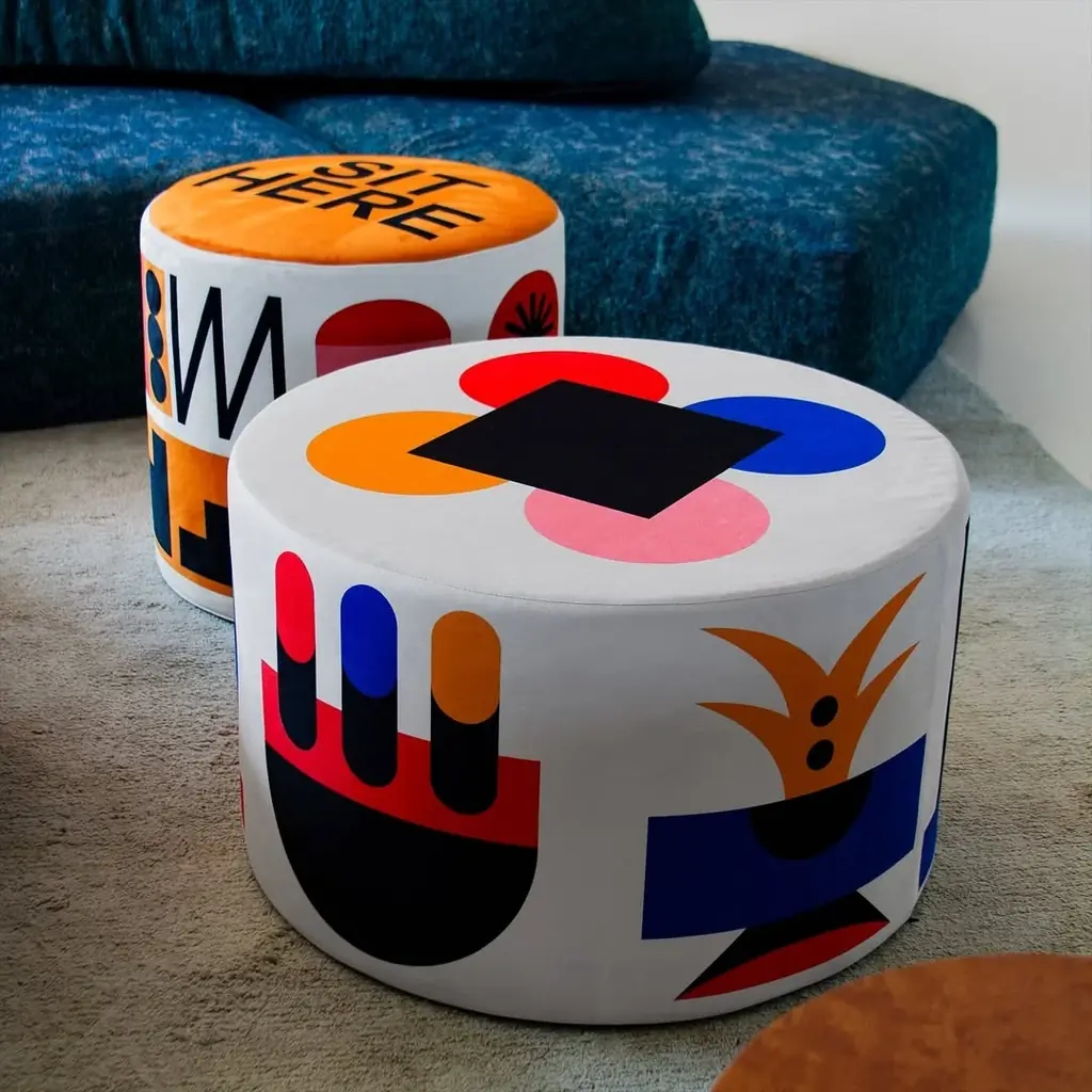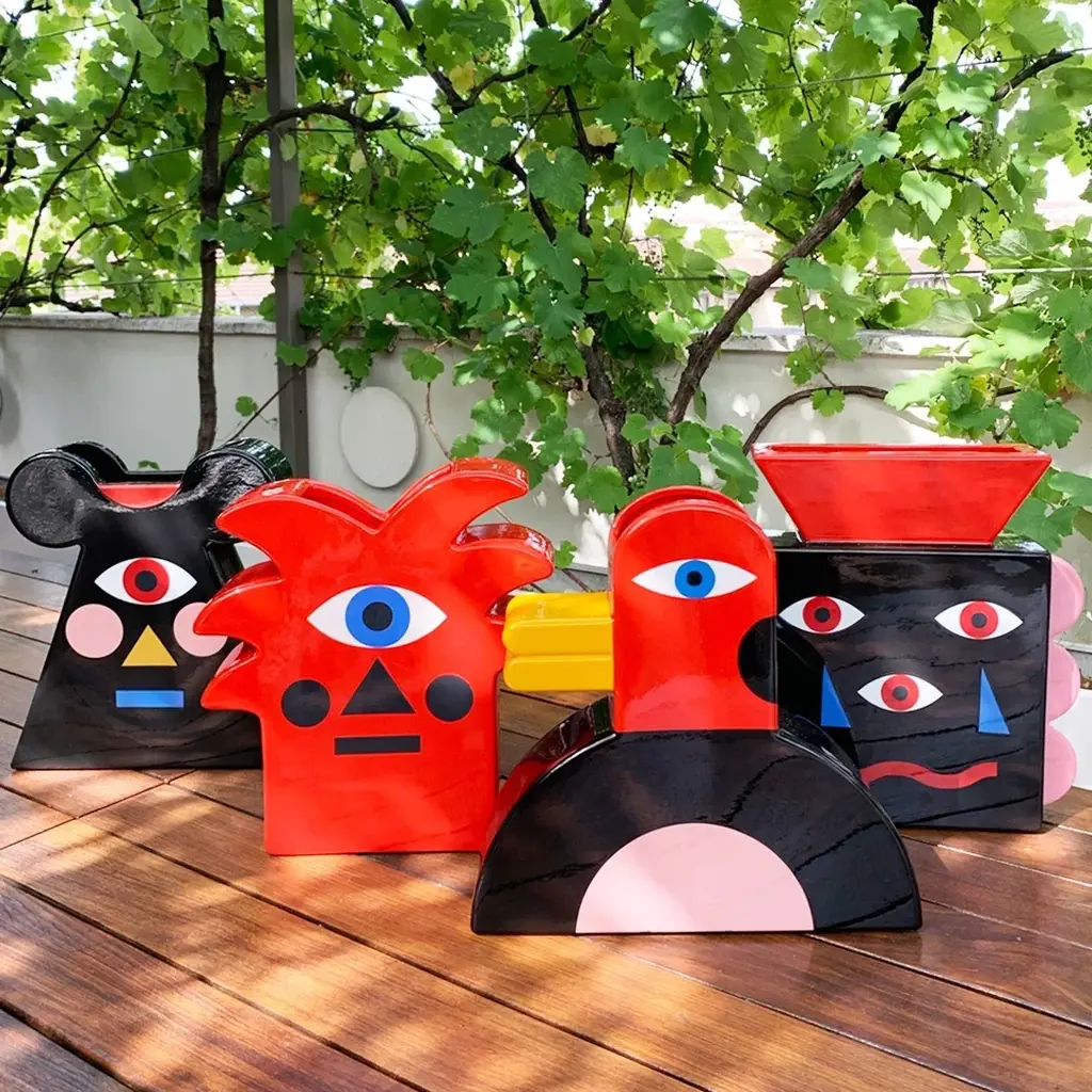 フラワーベースやキャンドルスティック、プフ、クッション、カーペット、コーヒーテーブル、ウォールクロックの7カテゴリを展開し、原色を大胆に使った幾何学的フォルムと社会的メッセージが併存する点が特徴です。