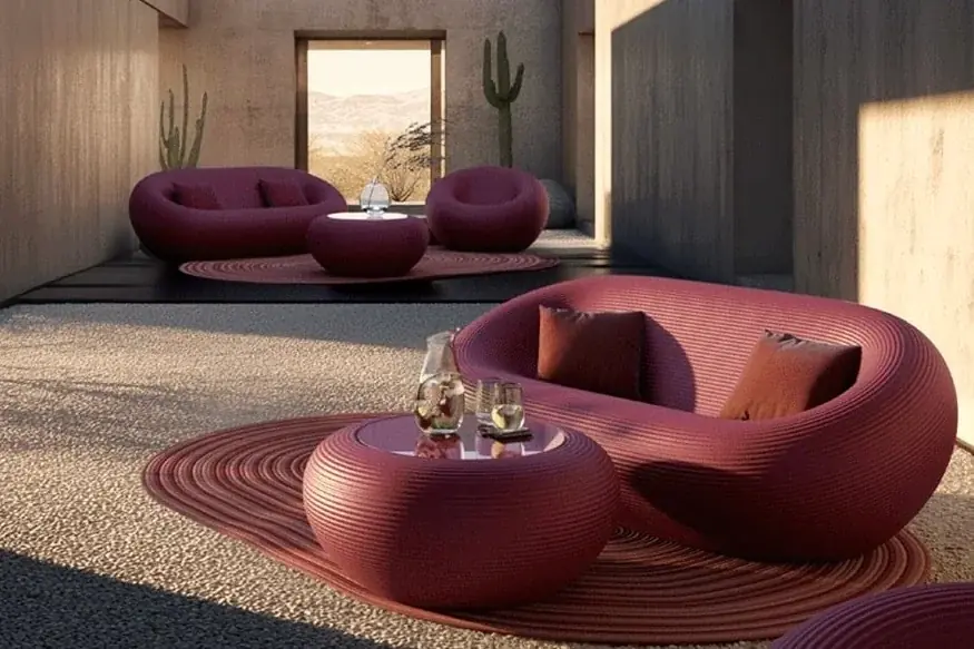 日本語の「波」をモチーフにしたアウトドアシリーズ。水面の波紋や巣のような有機的フォルムを特徴とし、屋外での使用に配慮した設計が施されています。ソファやアームチェアには排水構造が組み込まれ、耐候性を高める工夫がなされています。