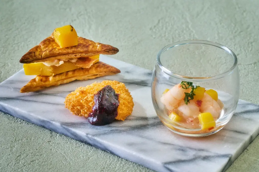 | セイボリー(主要) | ミルフィーユピザ(マンゴーのグリル)、小海老とマンゴーのマリネ(オリエンタル風)、チーズフライ(イチゴのコンポート添え) |